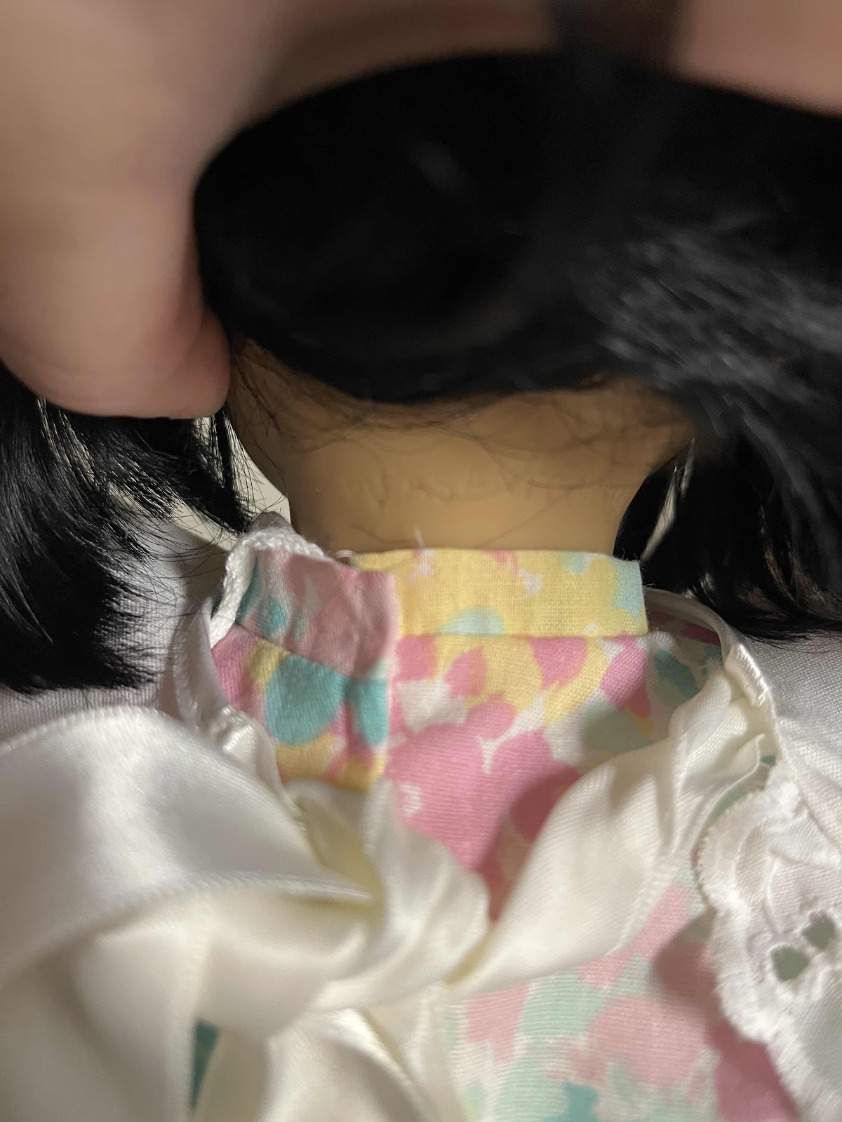 I bought this doll at a sale a while back. She is labeled Goetz Oriental Doll 10/20/86. She has a face and body like that of Pleasant Company Dolls. She has a white cloth body, flat neck strings and even has a Pleasant Company stamp on the back of her neck. She has thick short black hair with bangs. Her eyebrows are also black. Unfortunately, she does have silver eyes. Let me know what you think of this cutie.